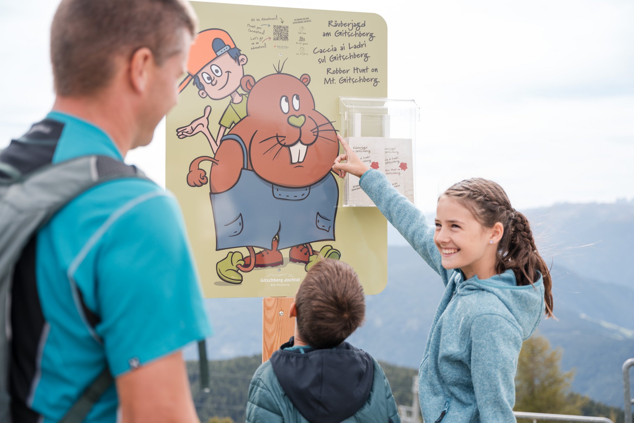 Start off at the Gitschberg valley station, where you can pick up your free treasure map and download the Locandy app. From there, take the cable car up to the Nesselbahn mountain station, where the robber hunt will lead you all the way to the Gitschhütte hut.